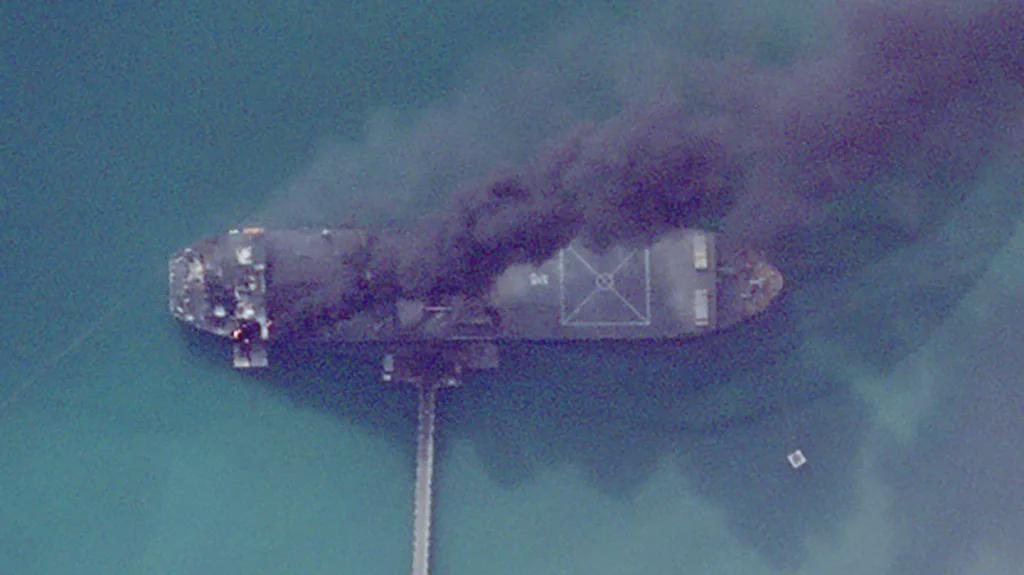 卫星图显示,马卡兰号前进基地舰停泊在阿巴斯港海军基地南端的一个泊位上,上层建筑右侧被命中并冒出了浓烟。上层建筑左侧也冒出了滚滚黑烟,这意味着该舰内部可能已经着火,且火势失去控制。集装箱船糟糕的抗损性可以判定该舰没救了。判断该舰为马卡兰号的原因为该舰舰首位置标志性的特大号直升机起降区。