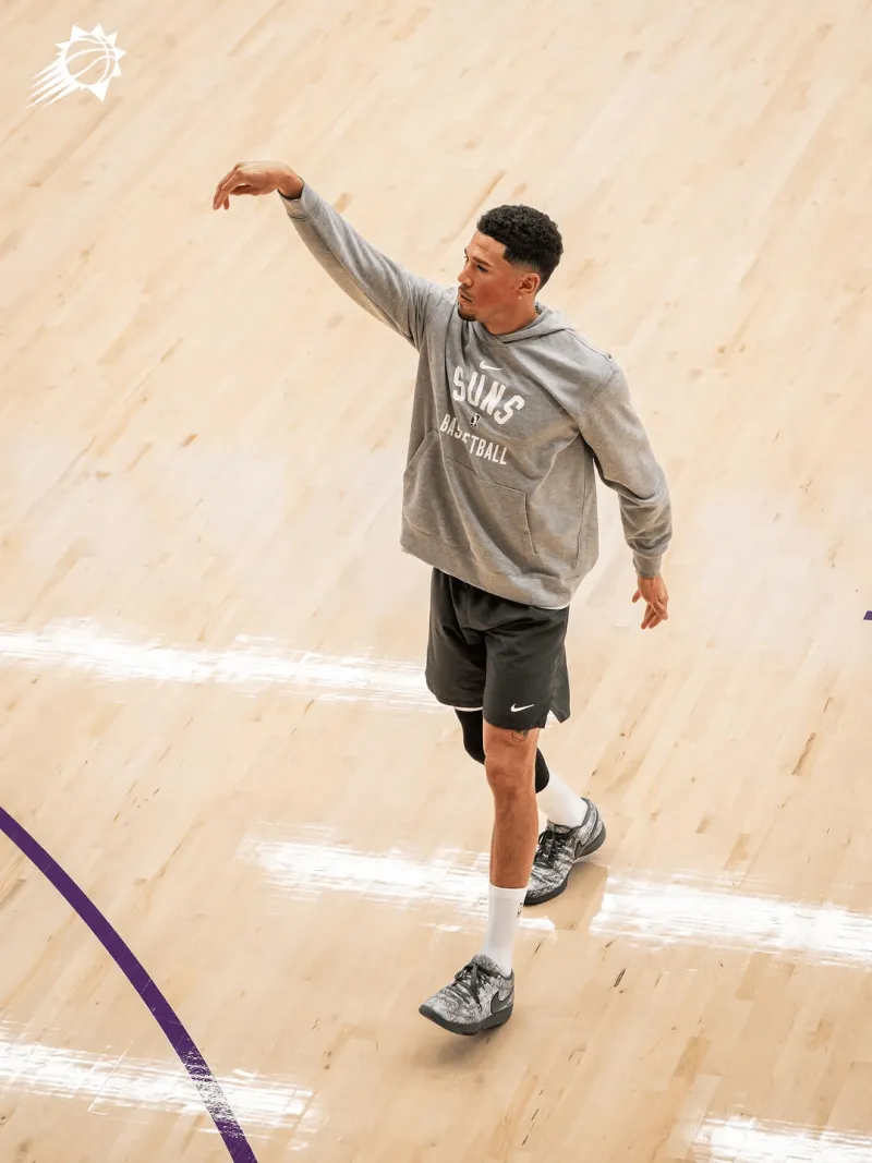 虎扑09月26日讯 根据太阳队官媒发布的队内球员训练照,德文-布克在训练中上脚新款灰碎叶迷彩配色Nike BOOK1 PE。